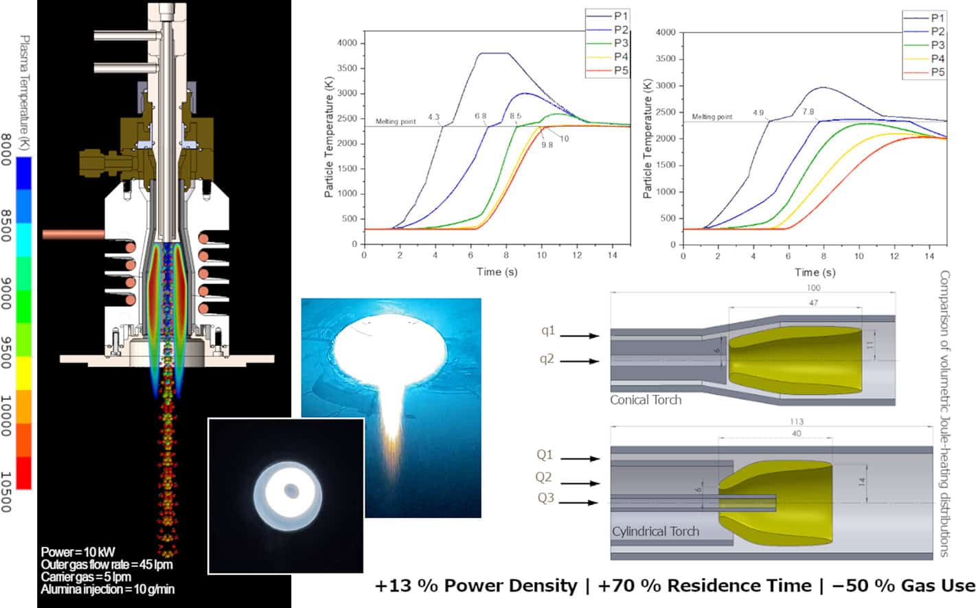 Compared with a benchmark cylindrical torch, the conical configuration achieved a 13% higher volumetric power density and extended the axial high-temperature zone by 27%, indicating enhanced plasma confinement. At 10 kW and an outer-gas flow rate of 50 L·min−1, measured particle temperatures and velocities (2300–3000 K; 29–65 m·s−1) showed good agreement with simulations. The conical torch generated an axial jet velocity of approximately 77 m·s−1 and increased particle residence time by about 70%, enabling efficient spheroidization. The torch demonstrated 25–50% lower gas consumption confirming the suitability of the conical RF-ICP torch for industrial-scale material processing applications.